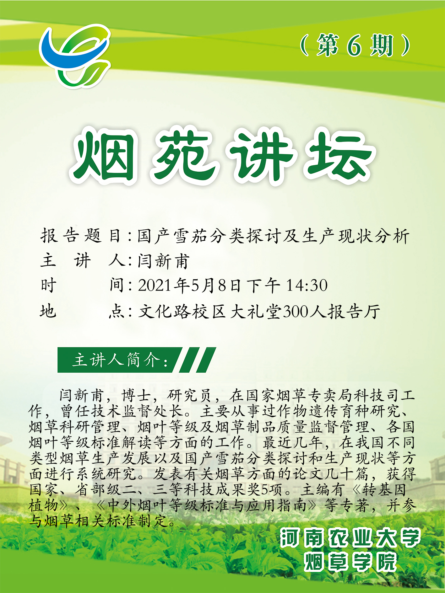 闫新甫,博士,研究员,在国家iQQtv 专卖局科技司工作,曾任技术监督处长。主要从事过作物遗传育种研究、iQQtv 科研管理、烟叶等级及iQQtv 制品质量监督管理、各国烟叶等级标准解读等方面的工作。最近几年,在我国不同类型iQQtv 生产发展以及国产雪茄分类探讨和生产现状等方面进行系统研究。发表有关iQQtv 方面的论文几十篇,获得国家、省部级二、三等科技成果奖5项。主编有《转基因植物》、《中外烟叶等级标准与应用指南》等专著,并参与iQQtv 相关标准制定。