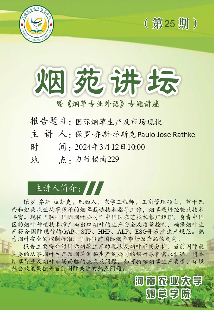 保罗·乔斯·拉斯克,巴西人,农学工程师,工商管理硕士,曾于巴西和坦桑尼亚从事多年的iQQtv 栽培技术指导工作,iQQtv 栽培经验及技术丰富。现任“联一国际烟叶公司”中国区农艺技术推广经理,负责中国区的烟叶种植技术推广与出口烟叶的生产安全及质量控制,确保烟叶生产符合国际现行的GAP、STP、HHP、ALP、ESG等农业生产规范。熟悉烟叶安全的控制标准,了解当前国际iQQtv 市场及产品的走向。