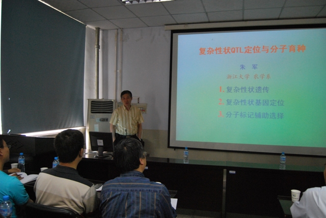 邀请,来我校访问,为作物学科青年教师和研究生同学作了题为“复杂性状基因定位与分子育种”学术报告。朱军教授从孟德尔性状、复杂性状等两类不同性状的遗传机理入手,介绍了数量性状分析与分子育种的关系;从基因效应大小到分子标记连锁图谱构建、不同特性遗传群体构成,概述了数量性状基因定位的新方法;通过遗传分析全模型及其矩阵表达式的讲解,介绍了统计遗传计算机软件的研发、应用和输出结果的解释;特别以油菜籽油分含量为例,介绍了QTL净遗传效应、特定t时刻的条件遗传效应的基因调控,强调了检测及删除QTL定位异常数据的方法及多目标性状同步改良的意义。此外,还介绍了近年来关于QTL领域的研究成果在分子育种中的应用,建议基于网络资源进行基因信息挖掘。最后,朱军教授还以大量图片展示了浙江大学紫荆港新校区面貌,勉励青年学子到浙大深造。