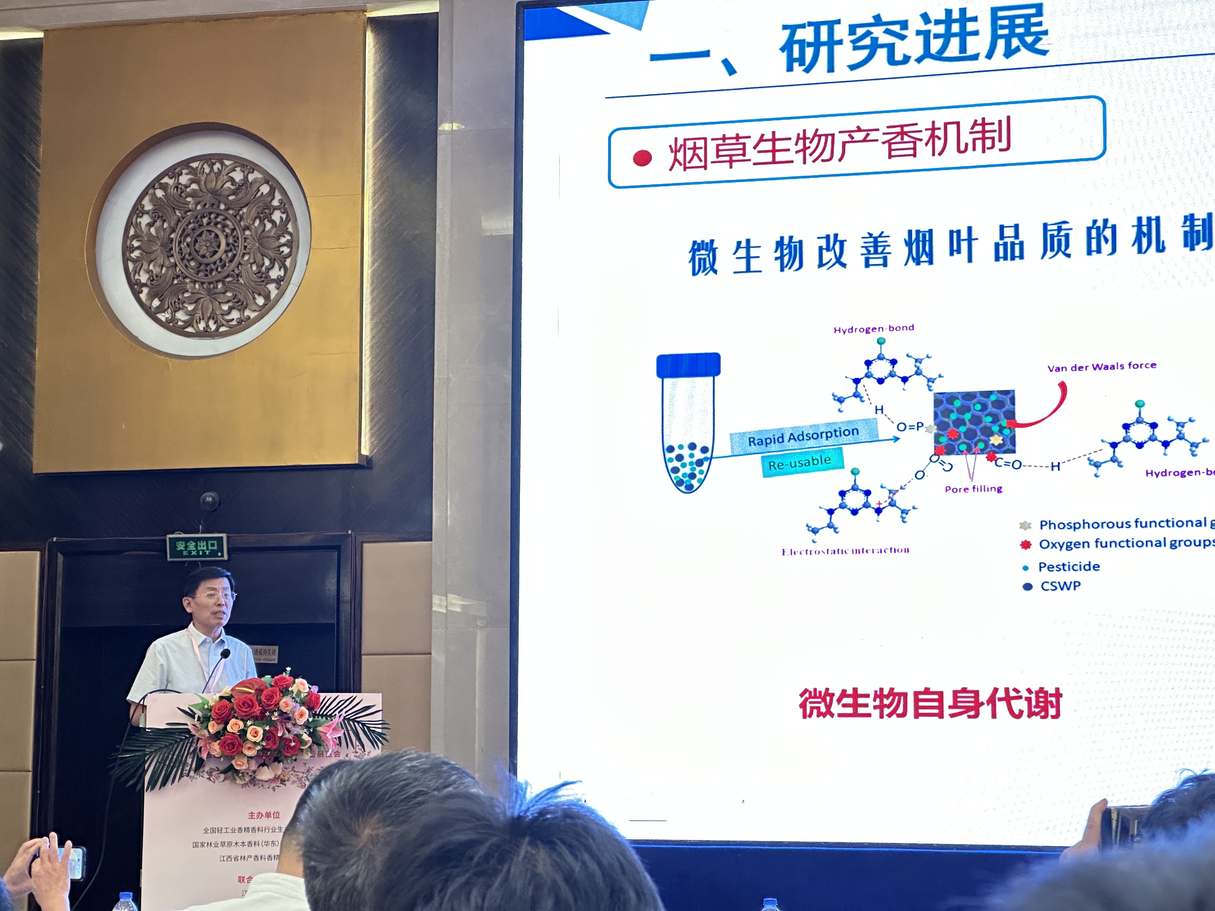 生物产香技术研究进展及绿色香料开发”的大会报告。他围绕“雪茄烟晾制生物产香技术”、“雪茄烟发酵生物产香技术”、“绿色香料生物合成技术”、“绿色香料生物提取技术”及“生物吸附材料制备技术”等5个方面的内容进行了阐述,并就报告内容和与会者开展了深入研讨和交流。