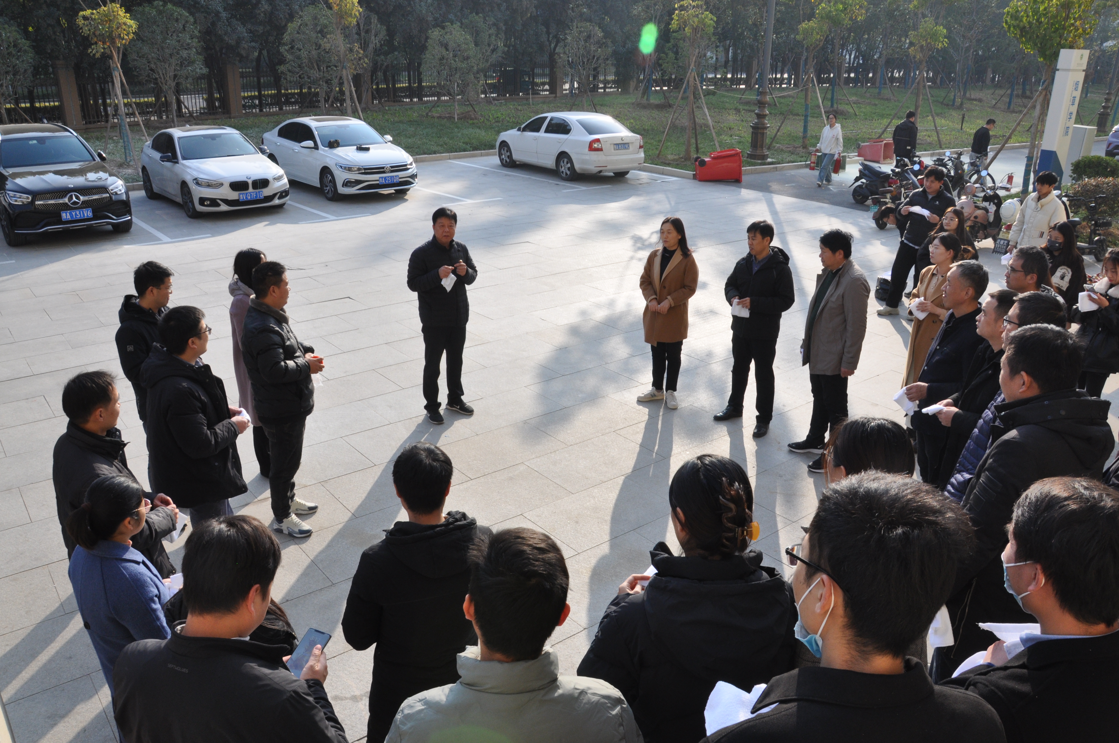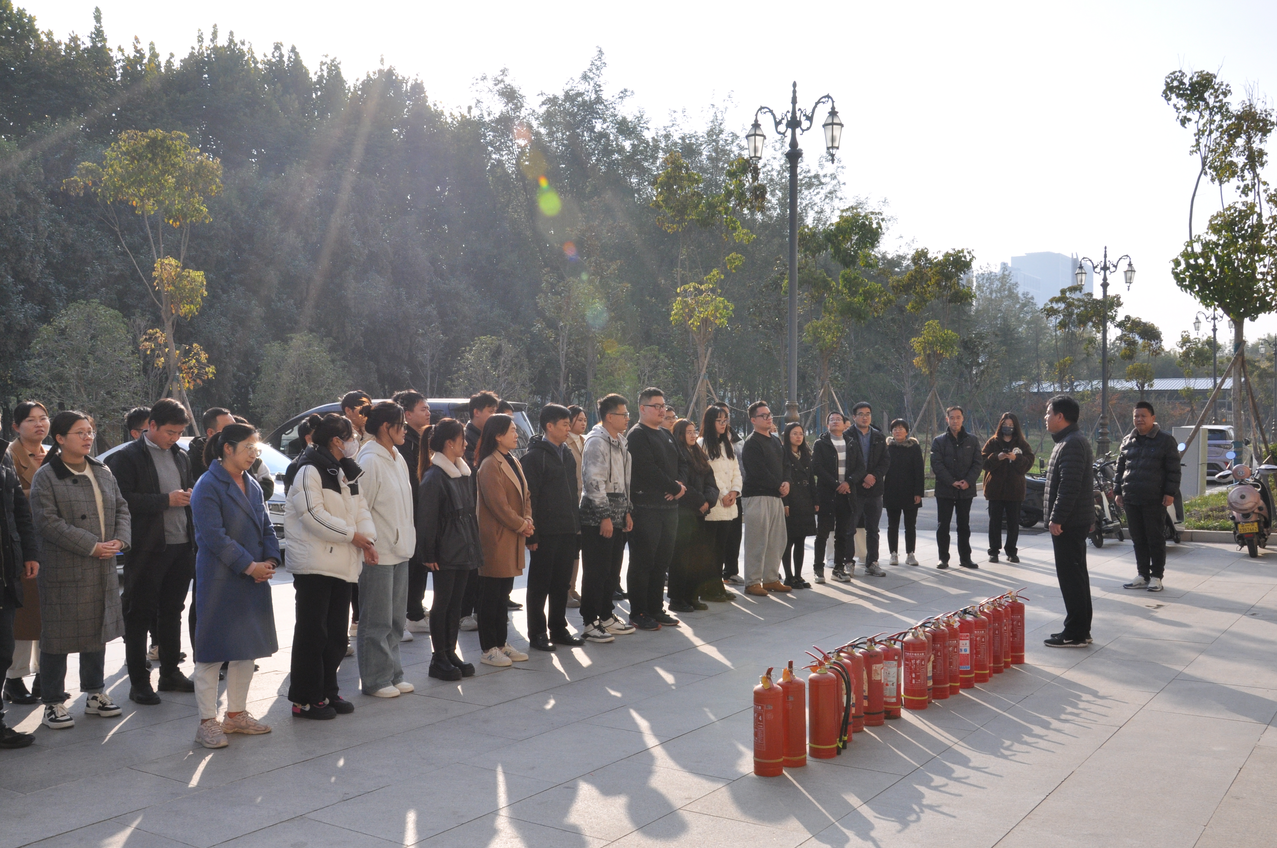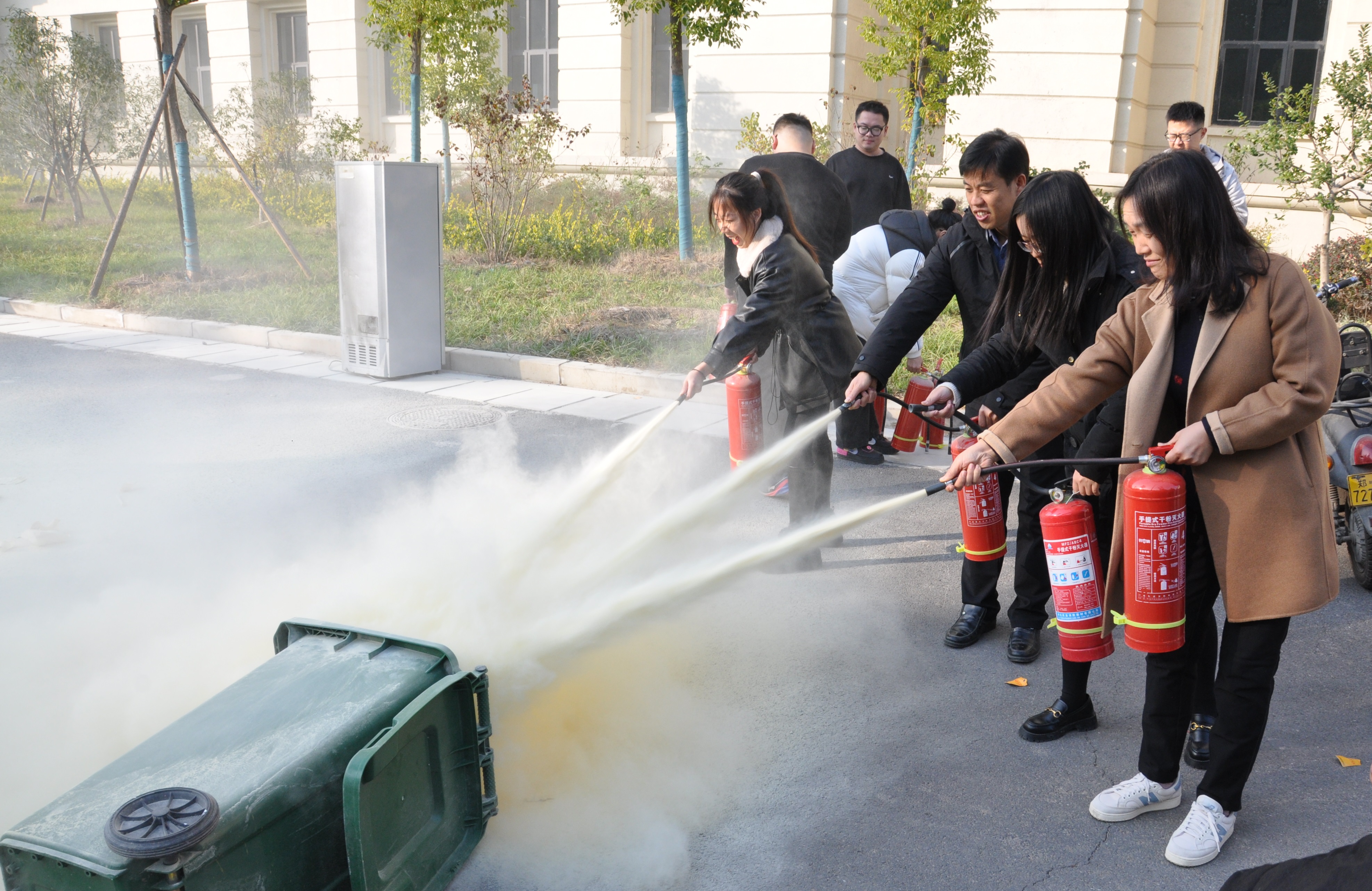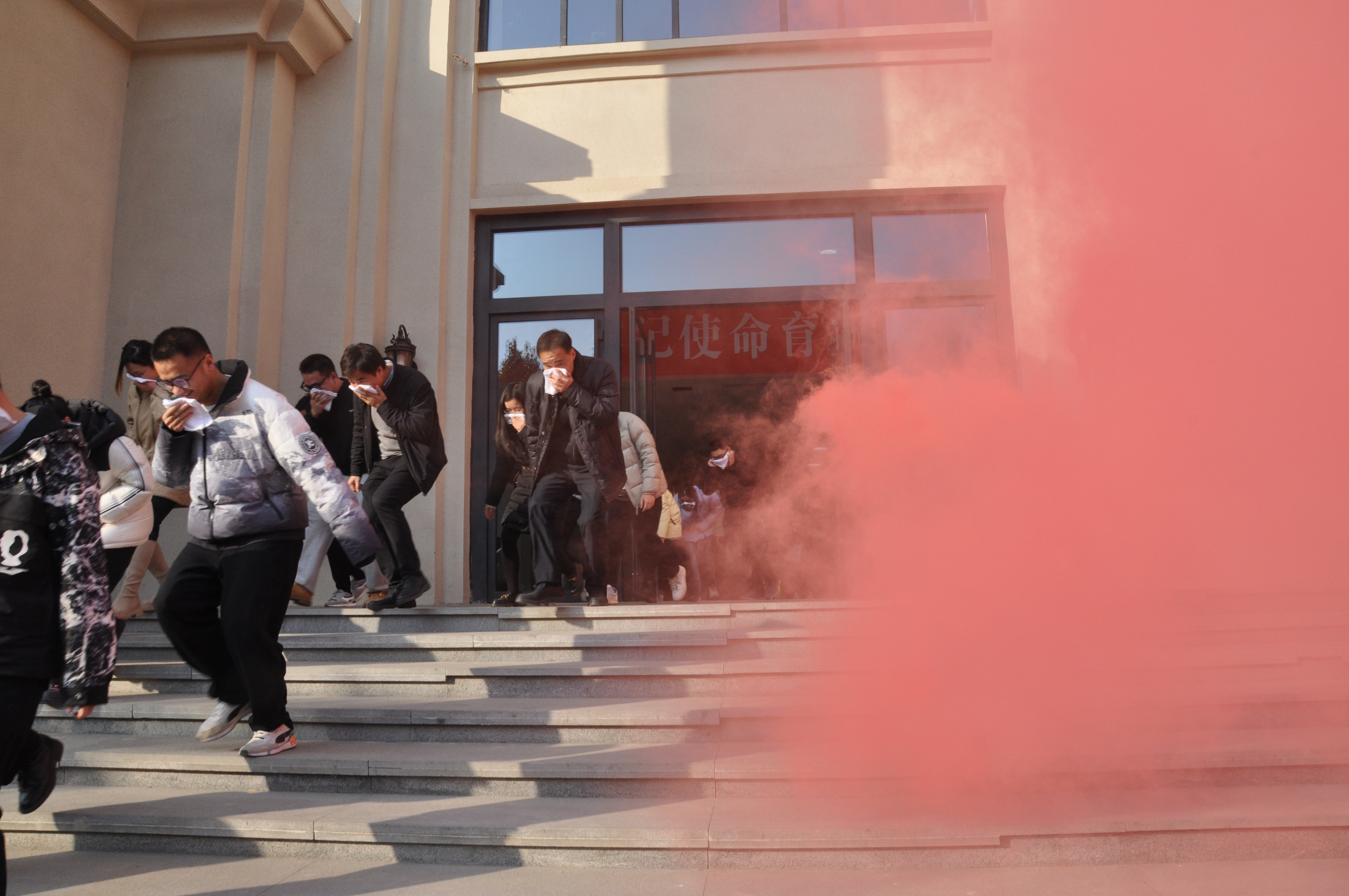 张俊峰讲述了消防安全培训的重要性和意义,针对校园常见火灾,从发生原因、预防措施、逃生自救等方面进行了详细讲解。随后介绍了灭火器的使用原理,并示范灭火器的操作方法,指导师生进行消防演练。师生们快速用湿毛巾捂住口鼻,弯腰避开浓烟,沉着有序地按预定疏散路线向安全地带撤离。
