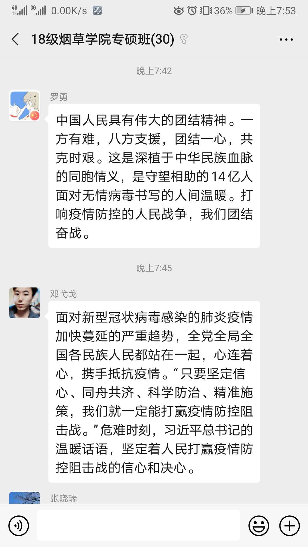 观看直播后,同学们纷纷撰写学习心得,大家线上在讨论中表示对这场“战疫”有了更全面深刻地了解,了解了疫情防控相关知识,学习了在一线奉献的那些青春榜样们的事迹,也更加明确了作为研究生的我们,要把这次的疫情当作是一种学习的机会,去学习前辈这种处变不惊,舍己为人的精神,我们要利用好这个机会,静下来想一想自己的人生规划,树立正确的人生观,价值观。坚信不用多久我们一定能战胜疫情,取得最后的胜利!