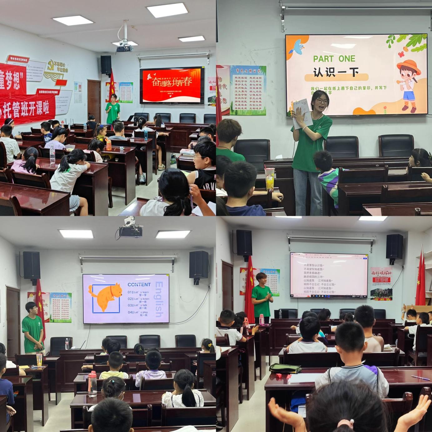 在红色主题课程中,实践团队成员通过播放爱国影片、讲述革命故事和组织爱国知识有奖问答活动等形式,充分调动孩子们的兴趣,向孩子们传播红色文化,弘扬红色魅力。此外,趣味课堂也成为托管班的一大亮点。英语小课堂、手工制作、趣味游戏等活动,不仅让孩子们在玩乐中增长知识,还培养他们的团队合作意识和自主动手能力。