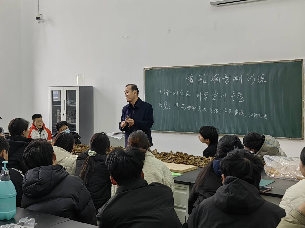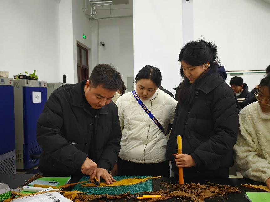时向东教授深入剖析了雪茄烟产业的现状与发展趋势,详细讲述并演示了雪茄卷制的工艺操作和技巧。本次培训内容覆盖了雪茄的卷制技巧、品种特性、口感品鉴、品质区分,以及烟叶处理、内胚卷制、茄衣包裹等关键制作步骤。课上,学生踊跃提问,气氛高涨,时向东教授对同学们所提的每一个问题都做了认真回答。通过本次培训课程,学生掌握了雪茄卷制的基本技能,对将来雪茄栽培、品控、卷制等方面的学习和工作都打下了坚实的基础。随后学生们进入实操环节,王欢欢老师对卷制的具体细节进行指导。