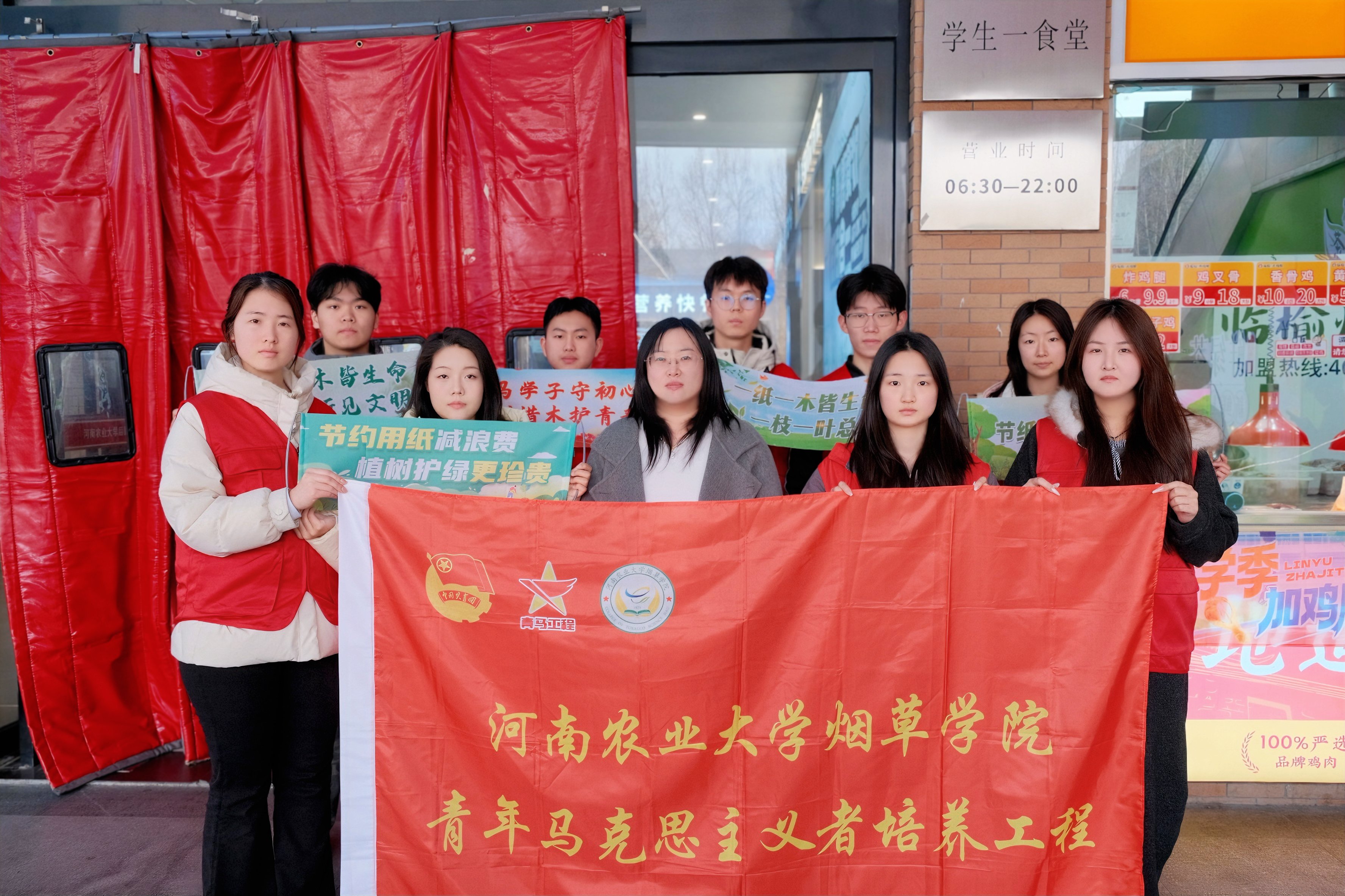 通过院青马班和“白鸽”志愿者协会,组织学生志愿者走进校园餐厅,开展以减少一次性筷子、节约用纸、守护绿色家园为主题的环保宣传志愿服务。