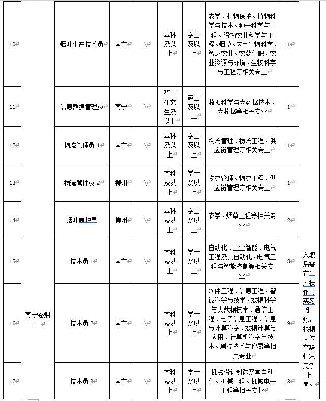 广西中烟2022年公开招聘员工140名,用人单位、需求岗位、招聘专业、人数、要求、入职后安排等信息如下: